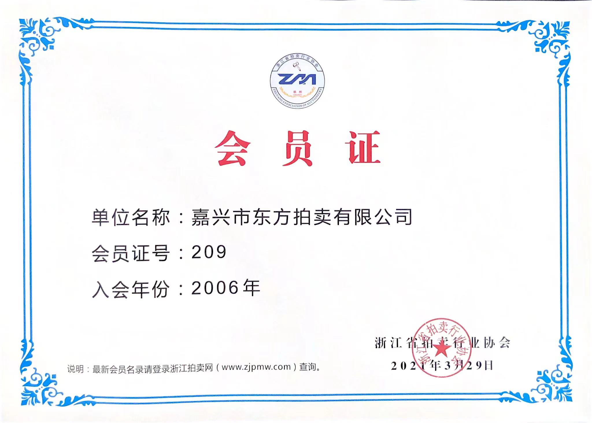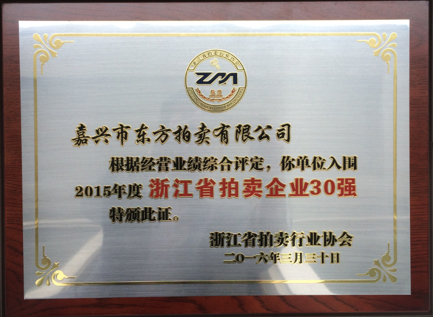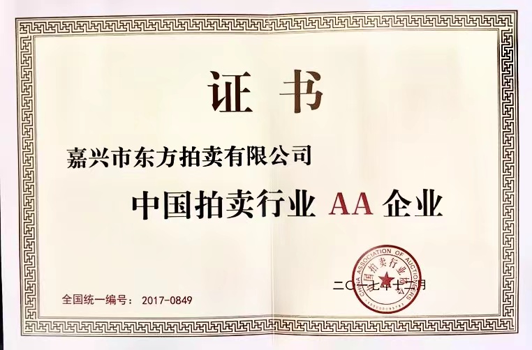同時(shí)具有浙江省人民政府國(guó)資委頒發(fā)的“浙江省國(guó)有產(chǎn)權(quán)轉(zhuǎn)讓業(yè)務(wù)資格證書(shū)”,商務(wù)部國(guó)際貿(mào)易經(jīng)濟(jì)合作研究院發(fā)的誠(chéng)信綜合等級(jí)“AAA”級(jí)證書(shū),人民銀行中小企業(yè)信用評(píng)定中心頒發(fā)的信用等級(jí)“AAA”級(jí)證書(shū),中國(guó)拍賣行業(yè)協(xié)會(huì)頒發(fā)的“AA”級(jí)拍賣企業(yè)證書(shū), 2010年、2013年、2016年、2018、2021年連續(xù)榮獲浙江省工商企業(yè)守合同重信用“AA”級(jí)單位,連續(xù)榮獲2007年、2008年中共南湖區(qū)委宣傳部、嘉興市工商行政管理局南湖分局等部門(mén)聯(lián)合頒發(fā)的嘉興市南湖區(qū)區(qū)級(jí)“誠(chéng)信企業(yè)”榮譽(yù)稱號(hào),2008年—2011年度連續(xù)四年榮獲中共嘉興市委宣傳部、嘉興市工商行政管理局等部門(mén)聯(lián)合頒發(fā)的嘉興市市級(jí)“誠(chéng)信企業(yè)”榮譽(yù)稱號(hào)(嘉興市拍賣業(yè)唯一獲獎(jiǎng)?wù)撸?,榮獲首屆浙江省拍賣行業(yè)協(xié)會(huì)頒發(fā)的“浙江省省級(jí)誠(chéng)信企業(yè)示范單位”榮譽(yù)證書(shū),榮獲浙江省拍賣行業(yè)協(xié)會(huì)頒發(fā)的2009年度“浙江省拍賣業(yè)統(tǒng)計(jì)工作先進(jìn)單位稱號(hào)”,榮獲浙江省拍賣行業(yè)協(xié)會(huì)頒發(fā)的“浙江省拍賣企業(yè)30強(qiáng)”單位,公司現(xiàn)為中國(guó)拍賣行業(yè)協(xié)會(huì)會(huì)員單位,浙江省拍賣行業(yè)協(xié)會(huì)(理事)會(huì)員單位、浙江省產(chǎn)權(quán)交易所會(huì)員單位。